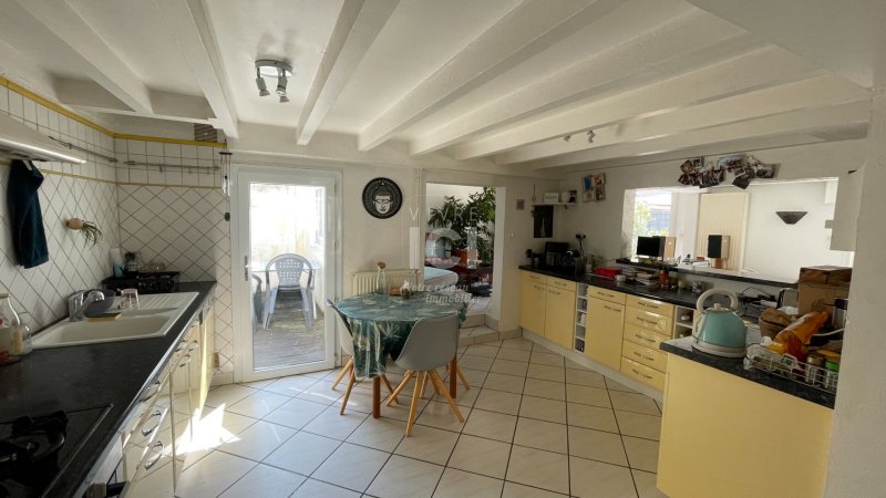 Rez-de-chaussée : véranda d'entrée avec placard, salon-séjour exposé ouest, cuisine ouverte aménagée et équipée, une salle d'eau, chaufferie, wc.