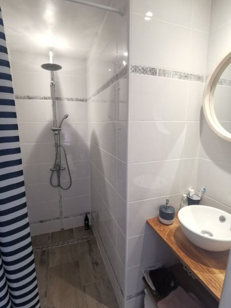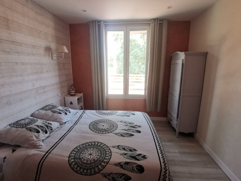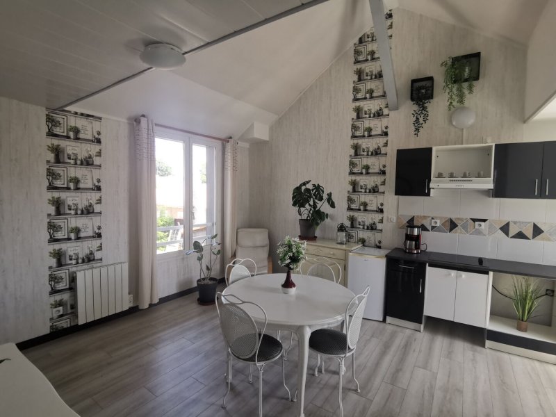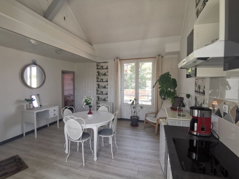 A 400m de la mer, cette charmante maison atypique est composée en rez de jardin d'une entrée par véranda, une pièce de vie avec sa cuisine A/E , un salon, un bureau, un wc, un coin buanderie, une grande chambre avec sa salle de bains et douche privative et donnant sur un jardin cocooning à l'abri des regards et au calme.