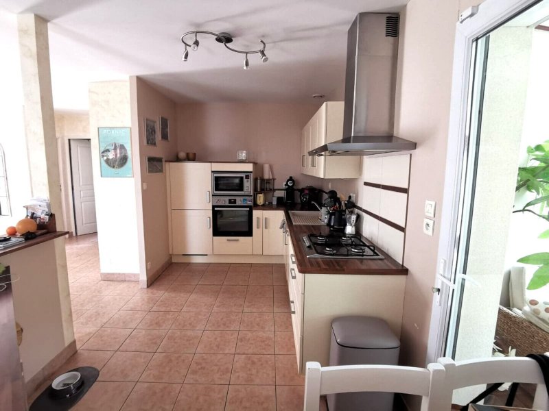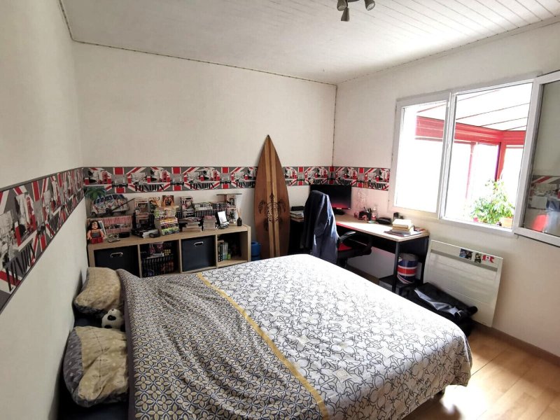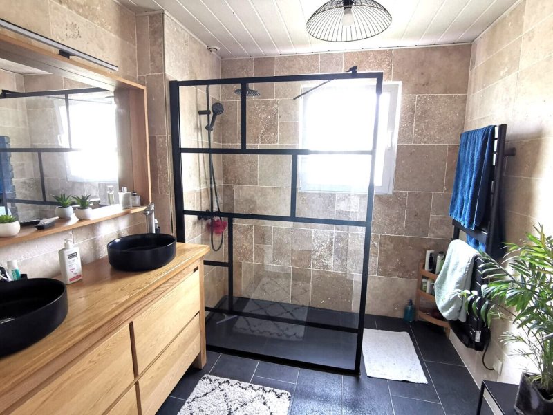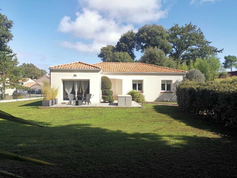 A 850m de la plage, maison de plain-pied d'environ 140m² offrant une cuisine A/E ouverte sur une très belle et grande pièce de vie avec poêle à pellets, une véranda, une salle d'eau, un wc, une buanderie, deux chambres et une suite parentale avec dressing. La terrasse orientée sud-ouest permet de profiter d'un joli terrain de 1650m² avec BBQ et abris de jardin. Pas de travaux à prévoir.