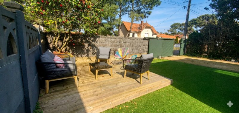 A l'extérieur se trouve un petit terrain bien pensé avec ses 3 terrasses pour profiter de l'extérieur fonction de l'ensoleillement de la journée.