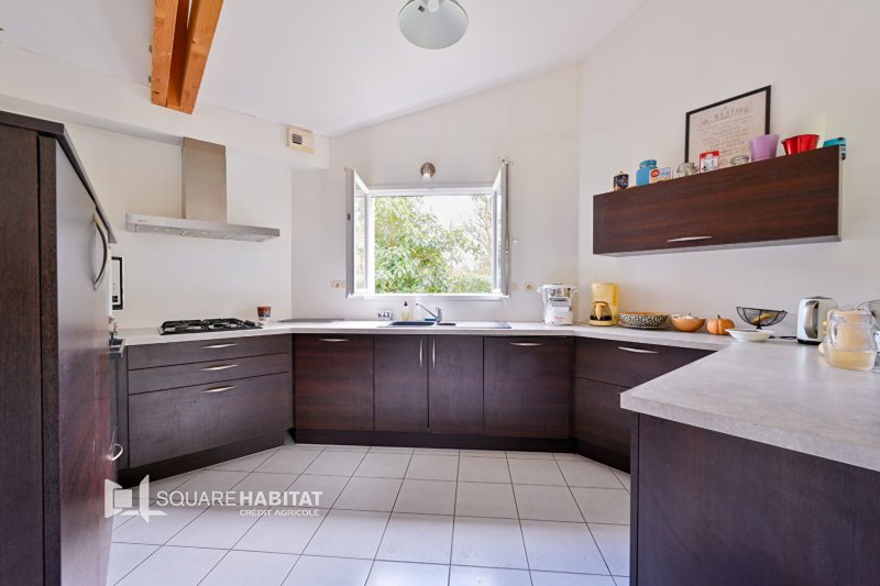 Dès l'entrée, vous découvrez une superbe pièce de vie baignée de lumière, sublimée par un poêle à bois qui apporte chaleur et convivialité. Elle s'ouvre naturellement sur une cuisine aménagée et équipée, créant un espace fluide et accueillant, idéal pour partager de beaux moments en famille ou entre amis.