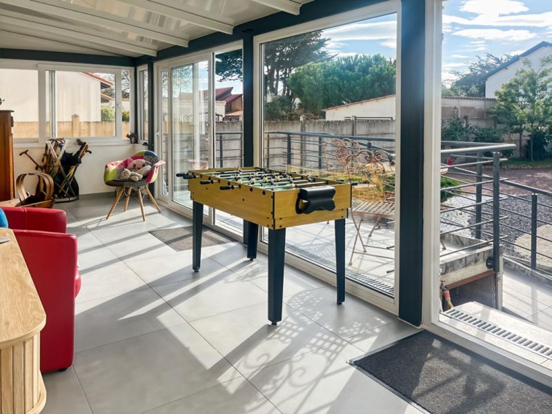 La vaste pièce de vie d'environ 60 m², prolongée par une véranda exposée sud-est, accueille une cuisine aménagée et équipée et un espace salon-séjour lumineux.