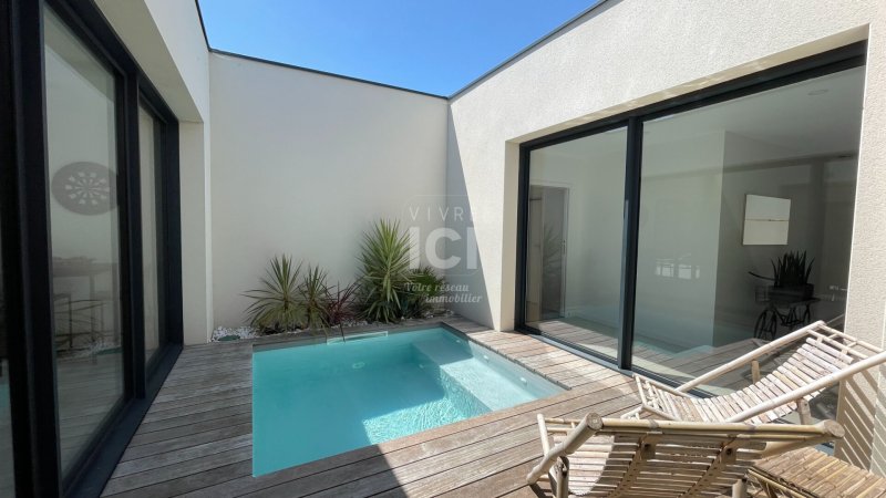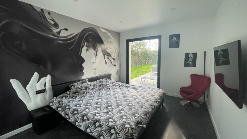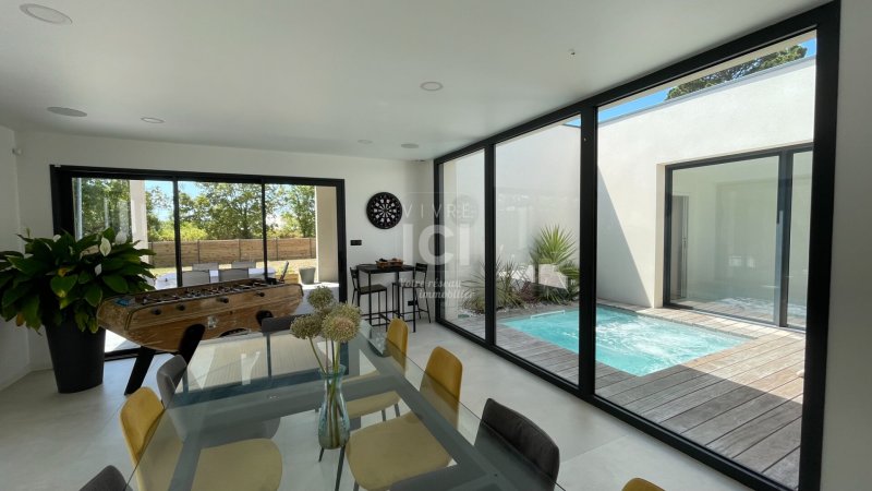 La maison se compose d'une entrée, une cuisine ouverte aménagée et équipée, une vaste pièce de vie baignée de lumière grâce à ses larges baies vitrées à galandage, une suite parentale de plus de 40 m² composée d'une chambre, un dressing, une salle de bains avec douche et baignoire, un wc indépendant. Un dégagement dessert un deuxième espace nuit avec trois chambres avec accès extérieur et dressing, une salle d'eau et un wc. Un bureau de 20 m² avec placard peut être convertit en cinquième chambre. La maison est organisée autour d'un agréable patio disposant d'une piscine balnéo chauffée avec terrasse. Une buanderie permet un accès au garage double de 78 m² avec local technique.