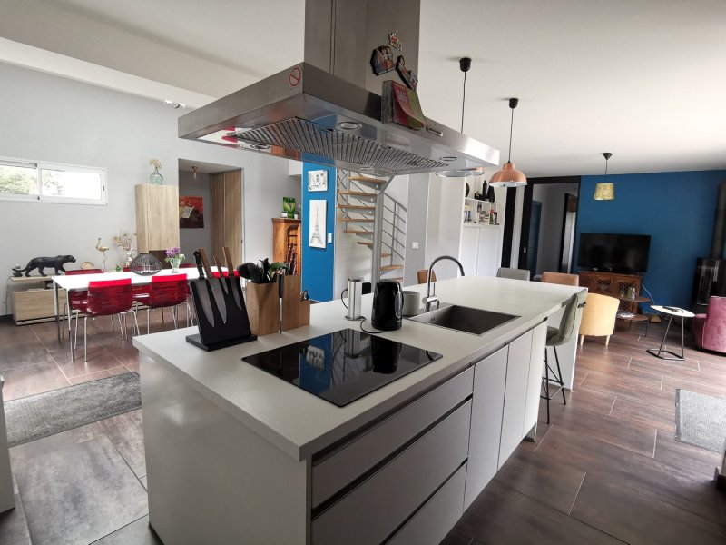 Dès l'entrée, laissez-vous séduire par une vaste pièce de vie lumineuse de 56 m² avec séjour, salon cosy autour d'un poêle à bois neuf, et une cuisine ouverte équipée avec îlot central. Une grande baie vitrée de 3 mètres s'ouvre sur une terrasse et sa cuisine d'été, parfait pour les journées ensoleillées.