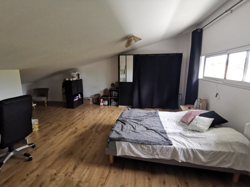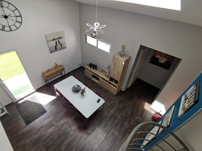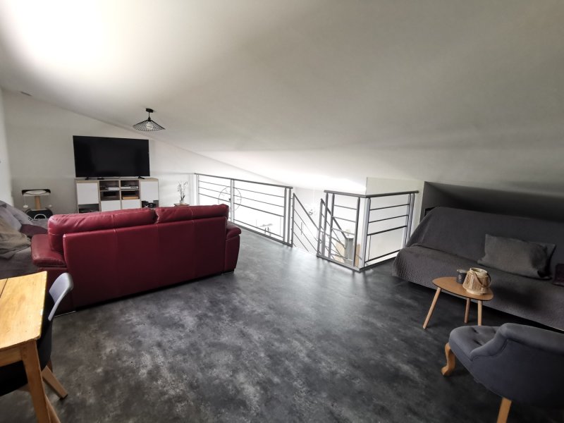 À l'étage, une spacieuse mezzanine distribue une grande pièce polyvalente (salle de jeux, détente ou chambre) ainsi qu'une chambre de 18 m².