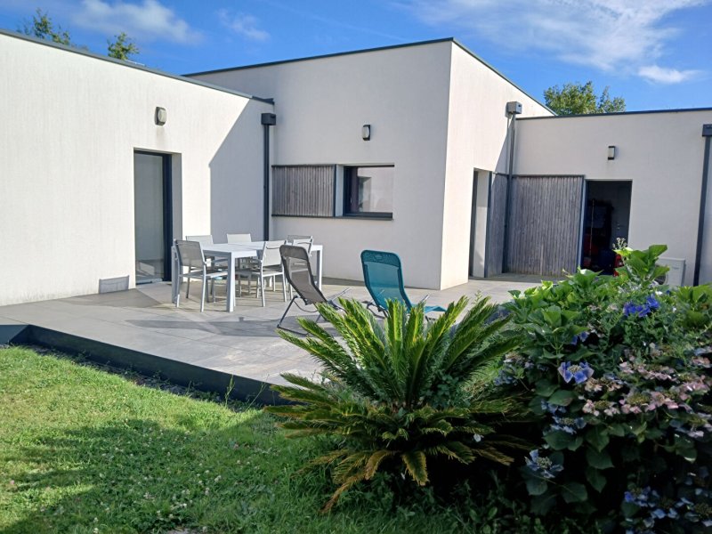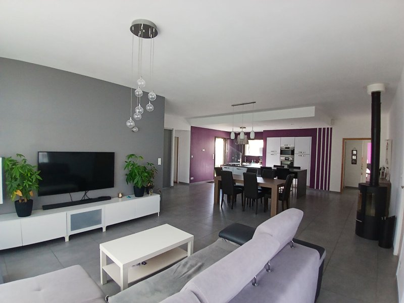 Dans le bourg, proche des commodités, jolie contemporaine de plain-pied de 2013 offrant une agréable pièce de vie de plus de 60 m² ouverte sur une cuisine aménagée et équipée baignée de lumière, 3 belles chambres avec placards, une buanderie, une salle de bain avec baignoire et douche à l'italienne. Très fonctionnelle de part ses rangements, ses garages. Belles prestations, chauffage au sol avec pompe à chaleur, menuiseries alu. sur une parcelle de 743 m².