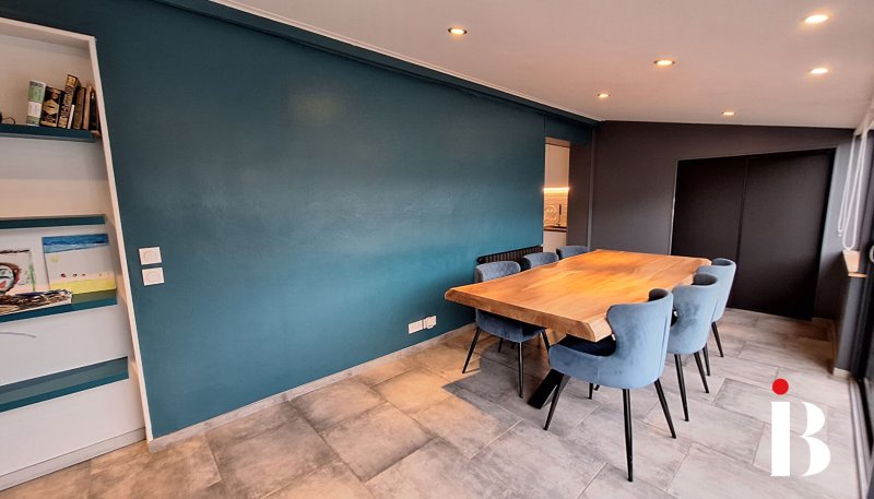 Le séjour, ouvert sur le jardin grâce à ses larges baies vitrées, est idéal pour les moments conviviaux autour de la table tout en profitant d'une vue direct sur les enfants qui jouent en plein air.