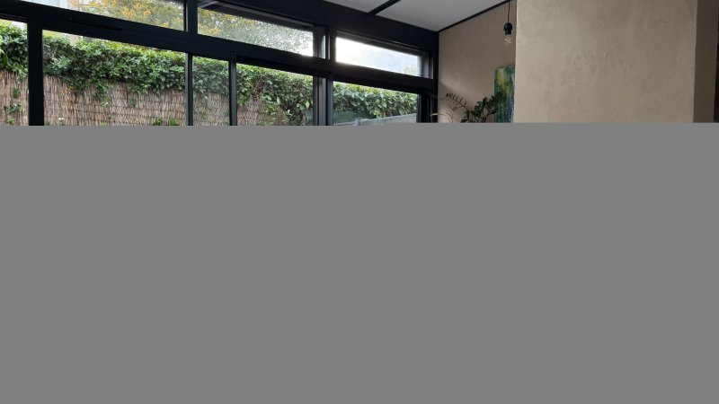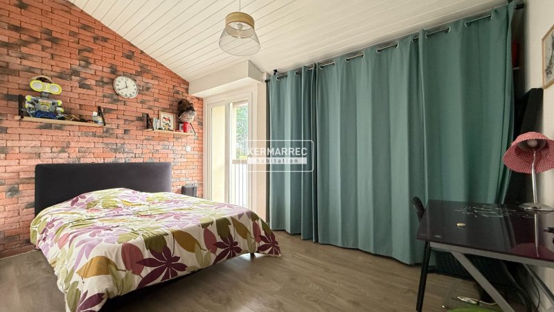 Le grand salon-séjour traversant de 45 m² avec poêle à bois s'ouvre sur une cuisine équipée conviviale et une véranda intégrée donnant sur un jardin clos sans vis-à-vis, une chambre spacieuse, une salle de bain avec WC et un garage attenant.