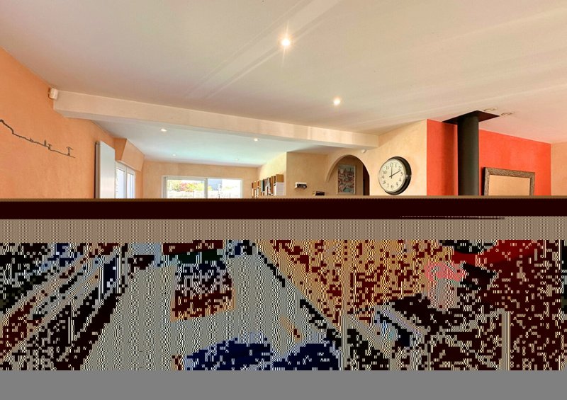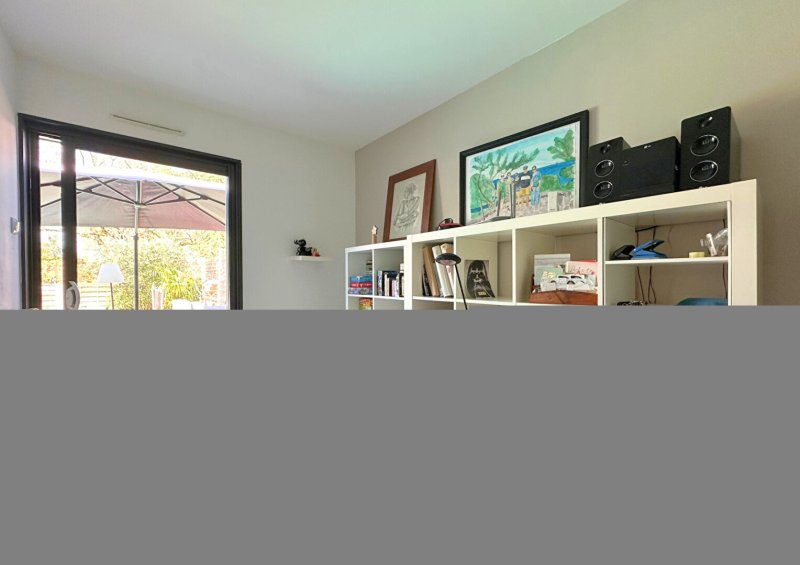 L'espace de vie de 50 m2 s'ouvre sur une cuisine aménagée/équipée avec une belle vue sur le jardin clos et arboré, la terrasse et la piscine chauffée.