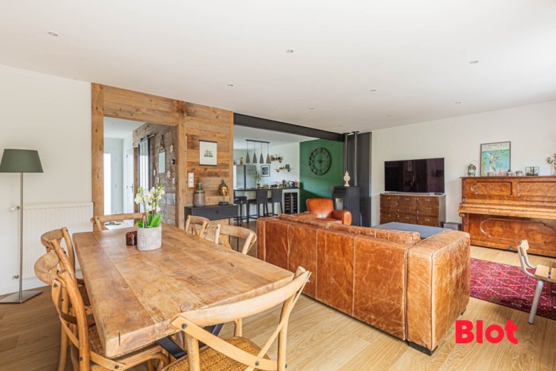 Au rez-de-chaussée après l'entrée, vous profiterez d'un lumineux salon-séjour, chaleureux avec son poêle et lumineux avec de belles ouvertures.