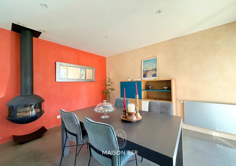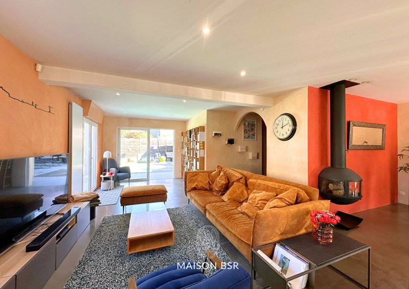 L'espace de vie de 50 m2 s'ouvre sur une cuisine aménagée/équipée avec une belle vue sur le jardin clos et arboré, la terrasse et la piscine chauffée.