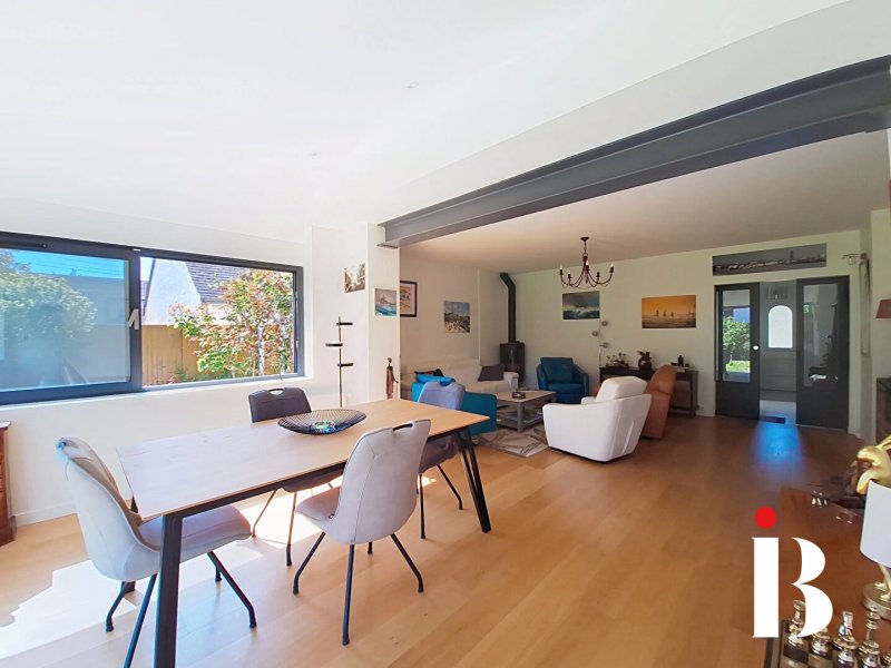 Vous serez séduit par une belle pièce de vie lumineuse ouverte sur l'extérieur, agrémentée d'un poêle à bois pour une atmosphère conviviale. La cuisine moderne, aménagée et équipée est parfaite pour concocter de bons petits plats.
