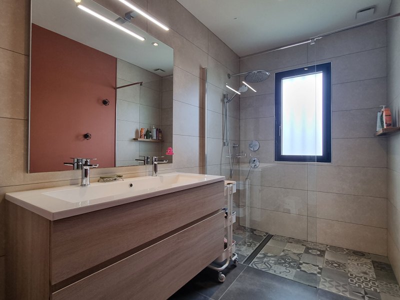 Côté confort : chauffage gaz, pompe à chaleur à l'étage (réversible chaud/froid), VMC double flux, huisseries alu double vitrage, une maison pensée pour un confort optimal toute l'année.