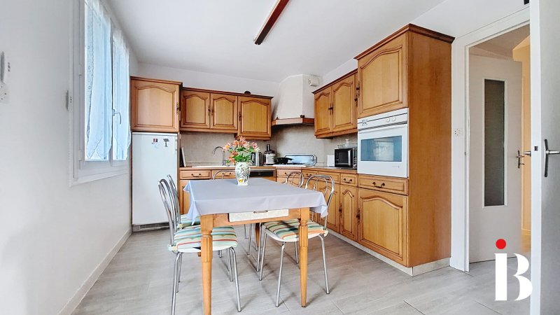 La cuisine s'ouvre sur l'espace de vie lumineux, offrant un accès direct à la terrasse ainsi qu'au jardin, entièrement clos et arboré.
