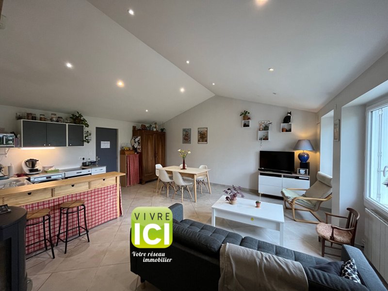 Elle vous propose une entrée, une pièce de vie lumineuse avec cuisine ouverte et poêle à bois, une arrière cuisine ainsi qu'un débarras.