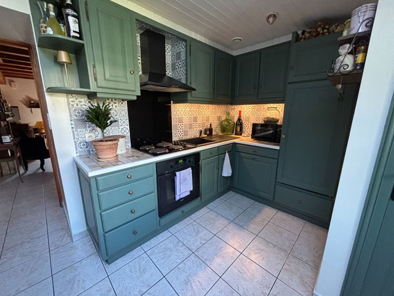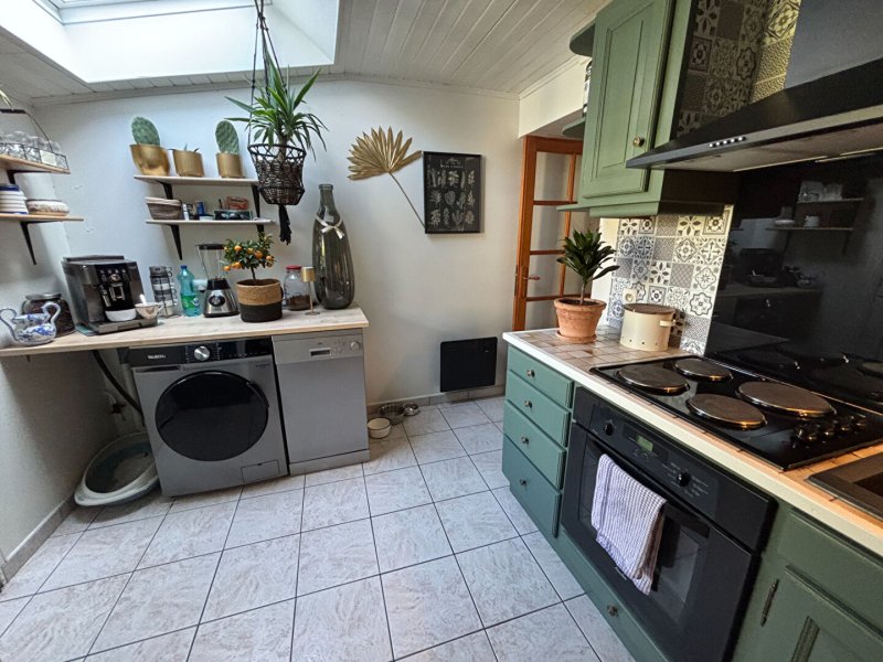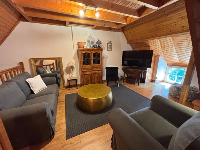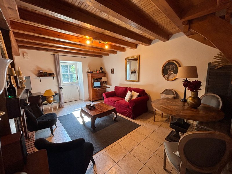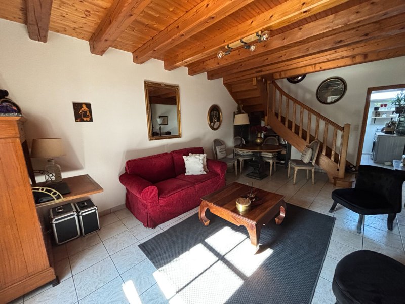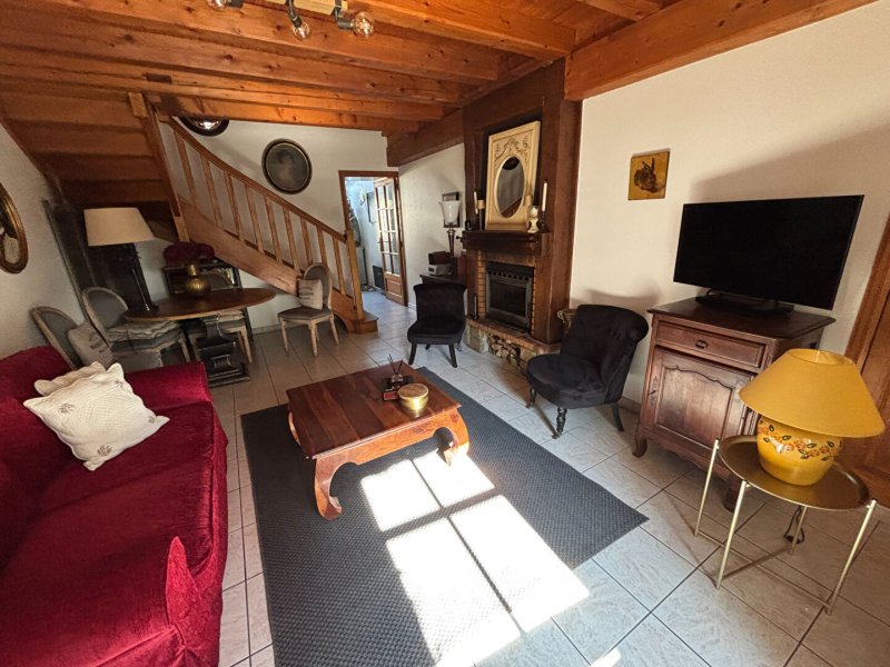 Au rez-de-chaussée : un salon séjour chaleureux, une cuisine aménagée et équipée, ainsi qu'un WC indépendant.