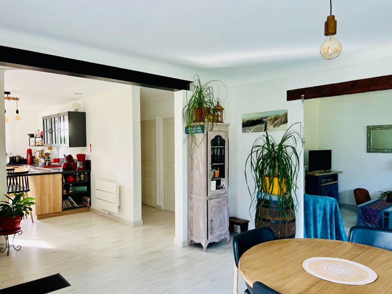 Vous y découvrez des pièces de vie lumineuses, triple exposition comprenant un espace salon, salle à manger avec poêle à granulés, une cuisine ouverte aménagée et équipée, une salle de bains, un WC, une buanderie et un garage.