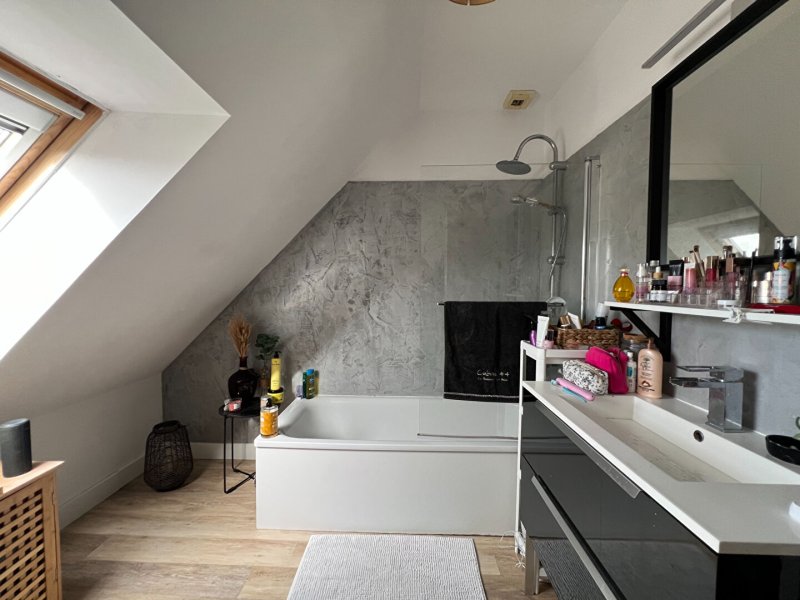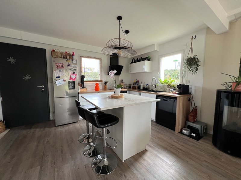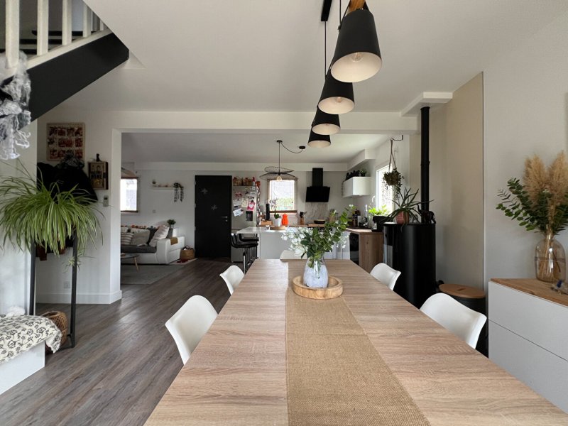 - au rez-de-chaussée : pièce de vie avec poêle à pellets, cuisine ouverte lumineuse, bureau/dressing, WC.