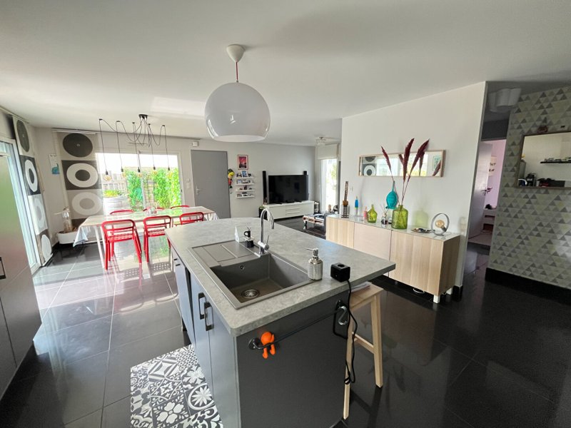 Elle se compose d'une pièce de vie lumineuse traversante donnant sur un jardin d'environ 500m², d'une cuisine ouverte aménagée et équipée, de trois chambres, d'une salle d'eau et d'un cellier.