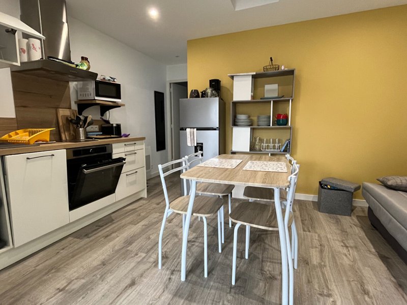 Elle offre une pièce de vie lumineuse avec cuisine aménagée et équipée d'environ 28 m², une chambre, ainsi qu'une salle d'eau avec WC.