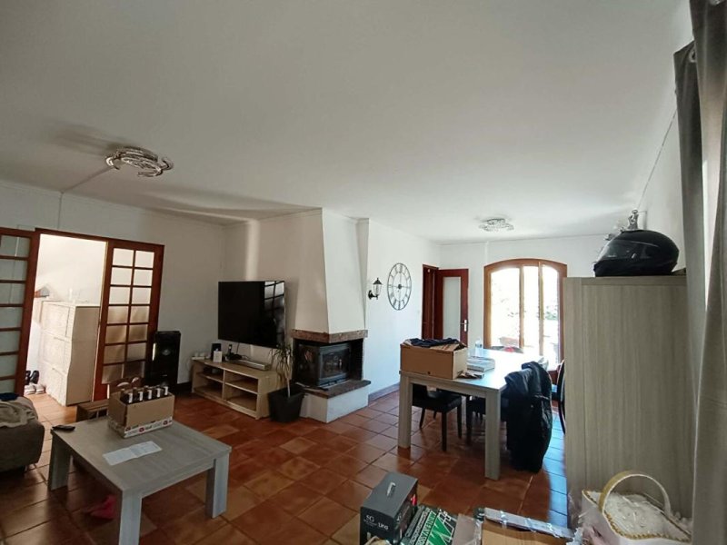 Le salon dispose d'une cheminée et de grandes ouvertures donnant sur une terrasse de 45m2 environ.