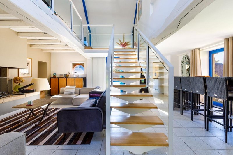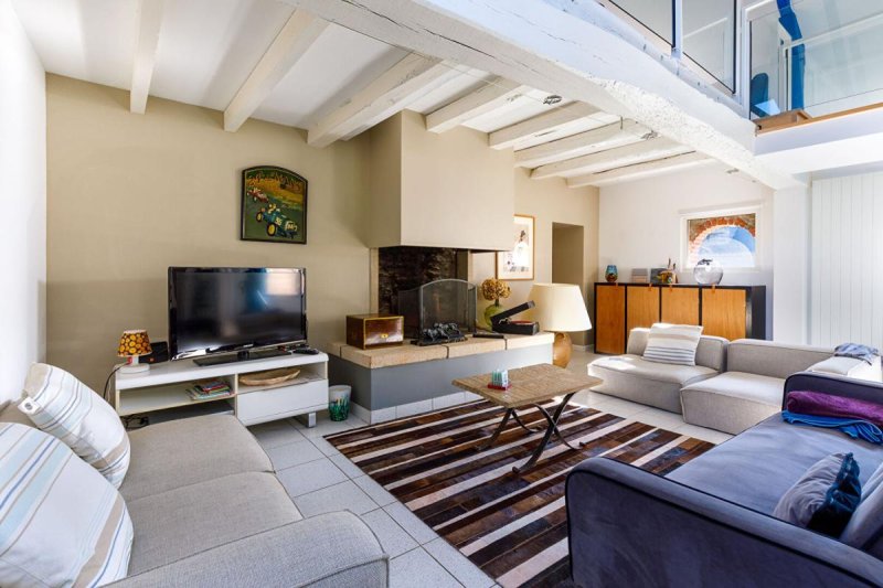 La seconde bâtisse, une longère en pierre au cachet préservé, s'ouvre sur une vaste pièce de vie avec cheminée, offrant elle aussi un superbe plafond cathédrale. Le rez-de-chaussée comprend également une entrée avec coin cuisine et une suite parentale équipée d'une salle de bains avec douche et baignoire. A l'étage, un palier en mezzanine surplombant le séjour dessert trois chambres et une salle de bains.