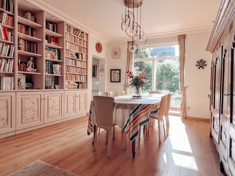 A l'étage : un palier avec de grandes bibliothèques, quatre chambres spacieuses et lumineuses avec placards, une salle d'eau avec double vasque, WC séparé.