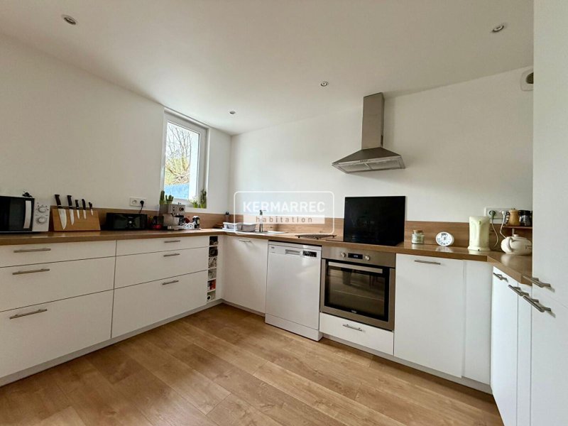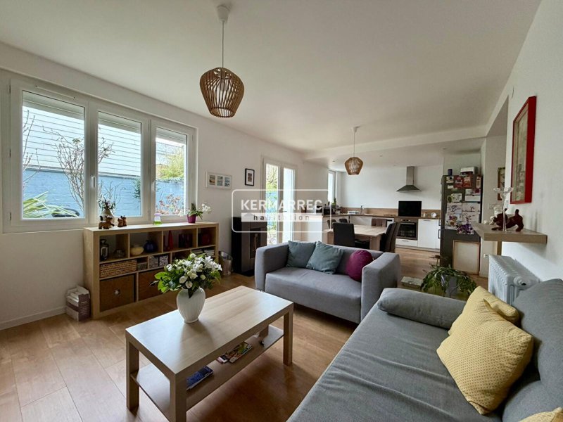 Au rez-de-chaussée : une vaste entrée dessert un WC, un garage de 15 m² ainsi qu'une belle pièce de vie baignée de lumière, agrémentée d'un poêle à granulés et d'une cuisine ouverte aménagée et équipée. Vous profiterez d'un accès direct au jardin.