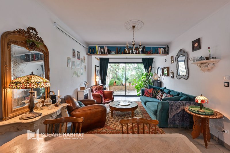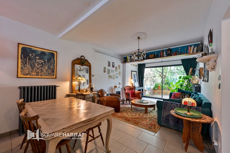 L'entrée mène vers la cuisine ouverte sur le salon séjour et sa baie donnant sur le jardin arboré.