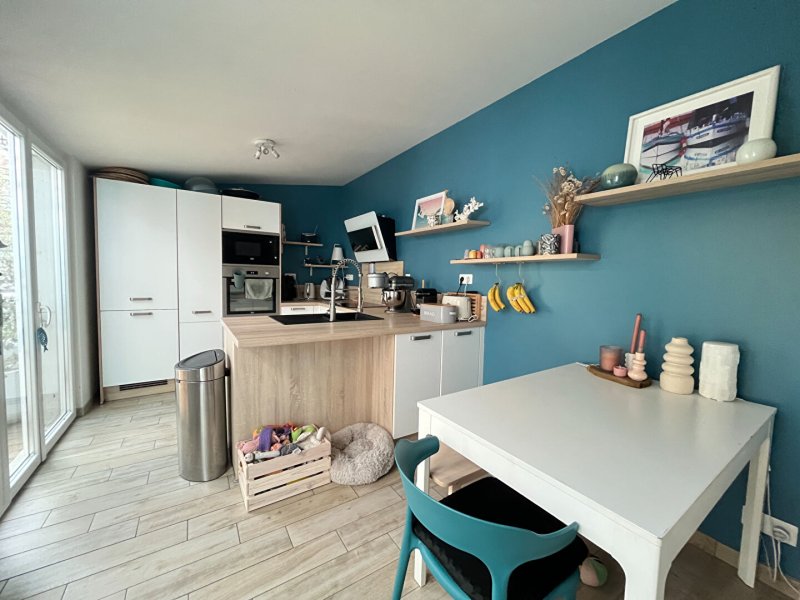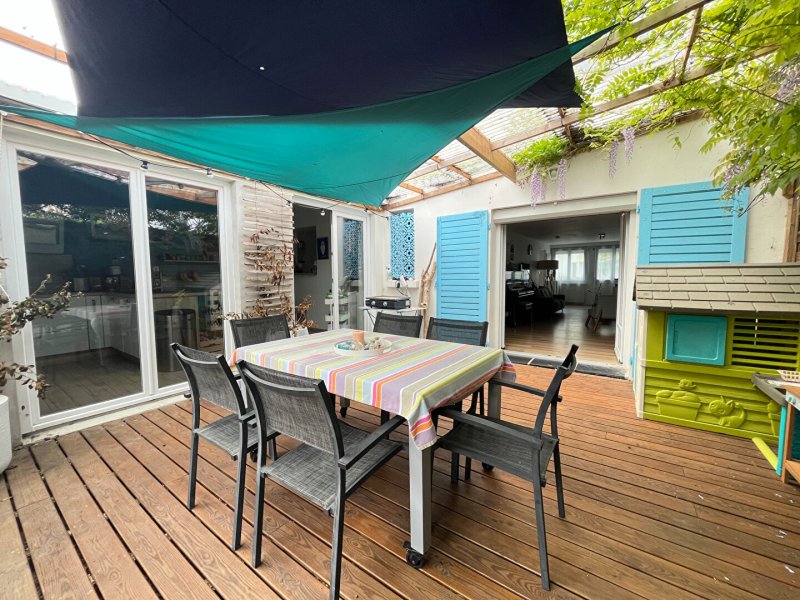 Au rez-de-chaussée, vous trouverez une entrée, un séjour traversant ouvert sur une terrasse conviviale, ainsi qu'une cuisine aménagée et équipée.