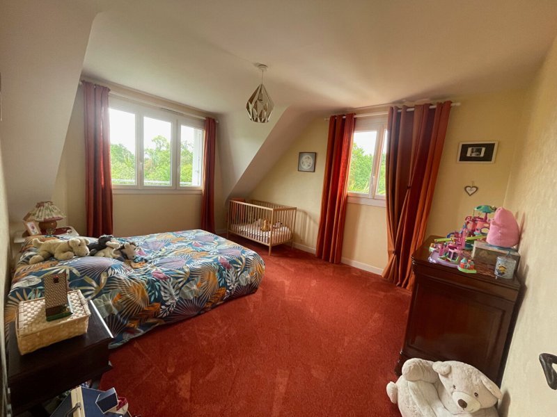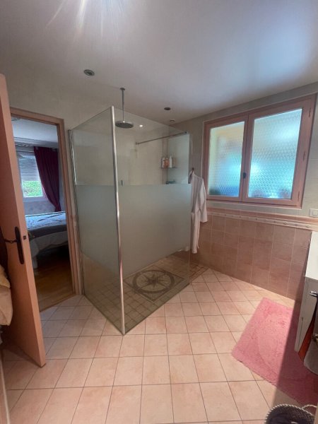 Belle maison avec des beaux volumes proposant au rdc une belle entrée avec placards, salon, salle à manger, cuisine aménagée et équipée donnant sur véranda avec un accès direct sur le jardin et la piscine, chambre au rdc, une salle d'eau privative, wc séparé avec lave-mains , cave et garage double.