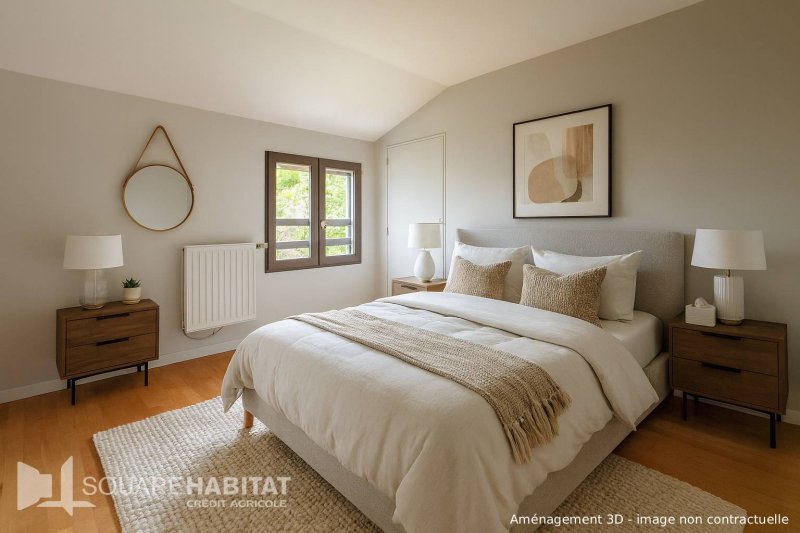À l'étage, vous trouverez deux chambres avec rangements, un bureau ou chambre d'enfant, et une salle de bains avec douche, baignoire et WC.
