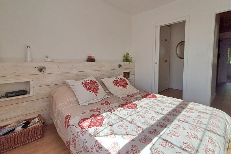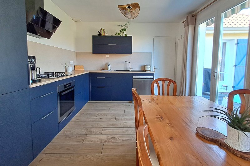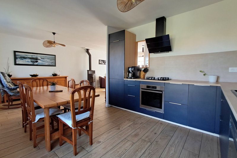 Elle offre une vie de plain-pied avec un salon-séjour traversant, lumineux, agrémenté d'un poêle à bois, ainsi qu'une cuisine aménagée et équipée avec accès direct à l'extérieur.