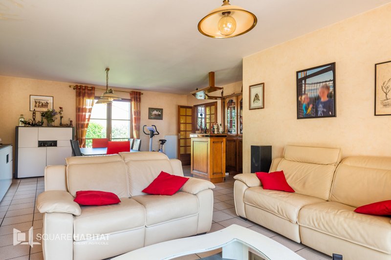 Vous découvrirez une agréable pièce de vie traversante, une cuisine aménagée et équipée avec accès direct sur une