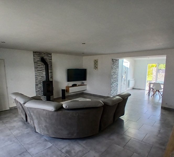 Au rez de chaussée, une cuisine aménagée et équipée, un salon séjour avec poêle à bois, cellier et un espace de 27 m2 pour une chambre parentale, dressing et salle d'eau à rénover. .
