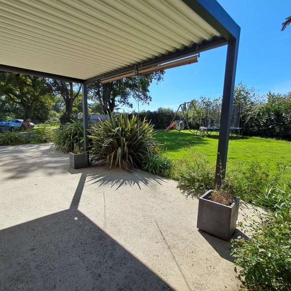 Vous apprécierez la luminosité de la pièce de vie, prolongée par une grande cuisine aménagée et équipée aux prestations modernes, le tout ouvrant sur une vaste terrasse agrémentée d'une pergola bioclimatique.