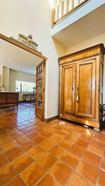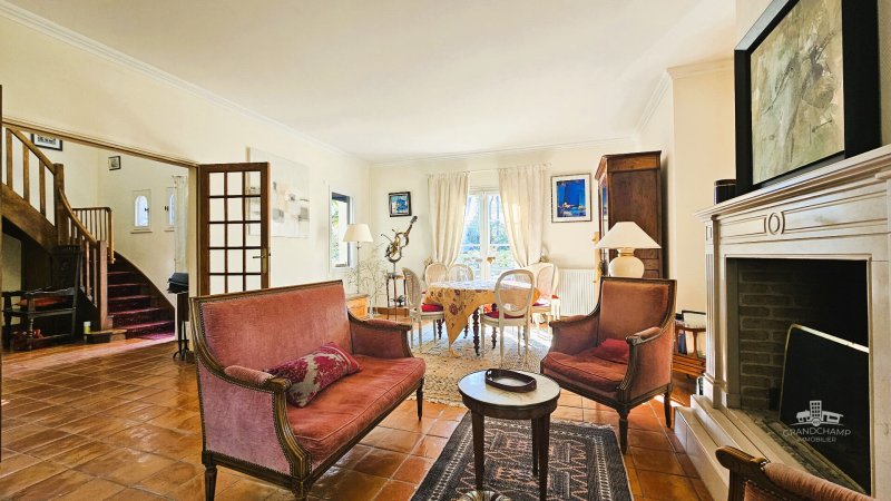 Au rez-de-chaussée, une entrée cathédrale de 12 m² dessert un vaste espace de réception de 78 m² composé d'un salon-salle à manger avec cheminée, un second salon communiquant avec la cuisine aménagée et équipée et bénéficiant d'une vue panoramique sur le parc et d'un accès à la terrasse et au jardin.