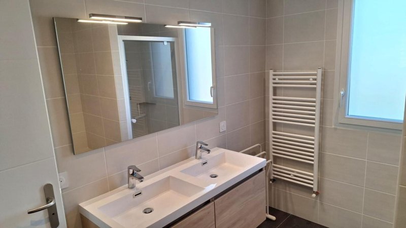 La maison est équipée d'une pompe à chaleur et d'un plancher chauffant, garantissant une température agréable en toutes saisons tout en optimisant la consommation énergétique.