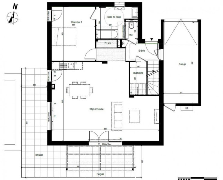 La maison offre au rez-de-chaussée, une cuisine ouverte sur un séjour de 48.50 m² donnant une pièce aérée et conviviale et s'ouvrant sur la terrasse et le jardin, ce qui apporte un maximum de luminosité à votre intérieur.