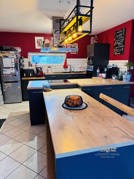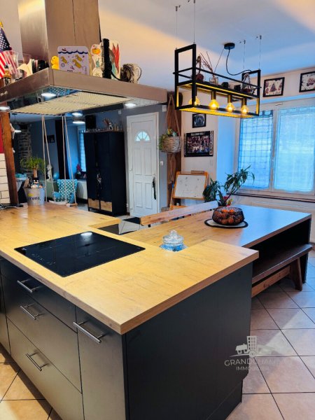 En RDC : une spacieuse pièce de vie de plus de 50 m² comprenant un espace salon chaleureux avec cheminée insert et un coin repas convivial avec cuisine aménagée et équipée.