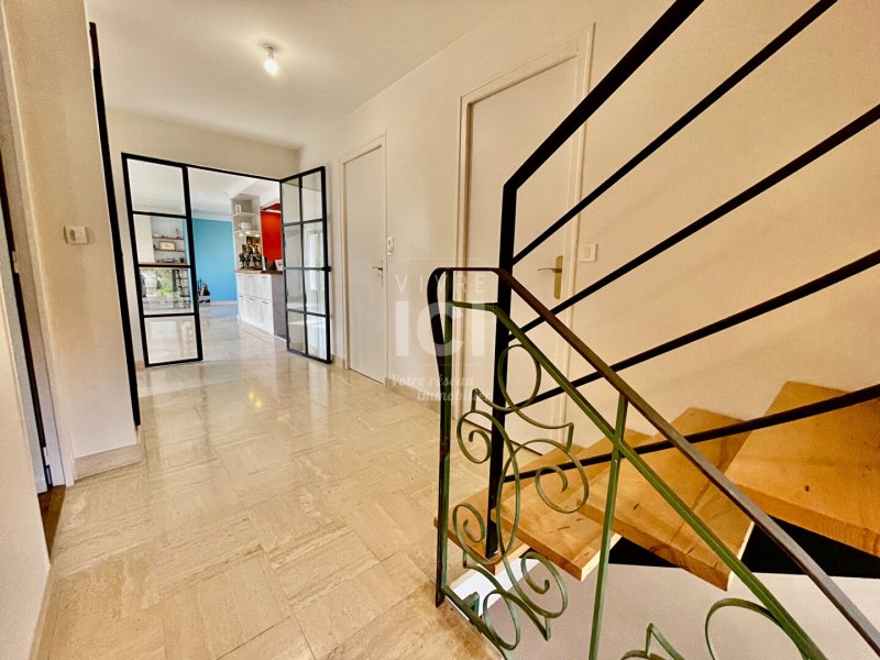 À l'étage, un vaste palier mène à deux nouvelles chambres, une salle de bain à rafraîchir et un second WC. Vous découvrirez ensuite une magnifique pièce de vie de près de 70 m², baignée de lumière, avec une cuisine Schmitt entièrement équipée et aménagée, ouverte sur trois balcons-terrasses offrant une vue dégagée sur le jardin arboré.