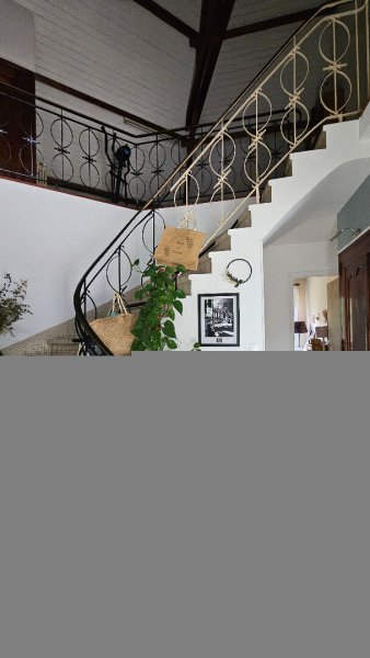 De l'entrée cathédrale, l'escalier dessert l'étage par la grande mezzanine distribuant d'un côté une grande chambre de 37 m² et les toilettes et de l'autre une chambre de 13 m² avec sa salle d'eau privative et deux greniers servant de rangement.