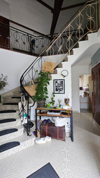 De l'entrée cathédrale, l'escalier dessert l'étage par la grande mezzanine distribuant d'un côté une grande chambre de 37 m² et les toilettes et de l'autre une chambre de 13 m² avec sa salle d'eau privative et deux greniers servant de rangement.