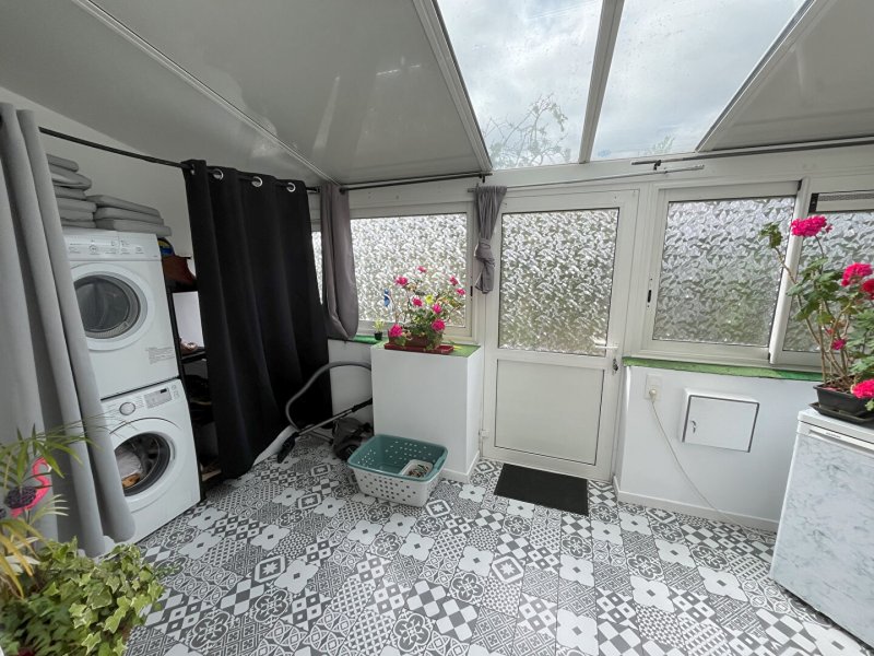 Au rez-de-chaussée, vous profitez d'un sas d'entrée avec espace buanderie, d'une cuisine aménagée et équipée, d'un grand salon convivial, et d'une véranda baignée de lumière donnant sur un jardin arboré et sans vis-à-vis, idéal pour vos moments de détente.