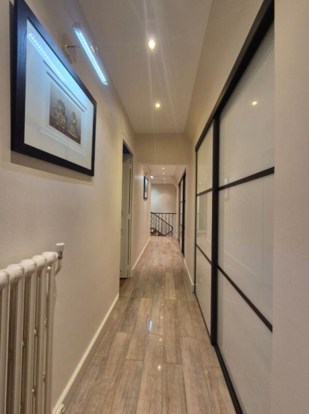 Composée au rez de chaussée de deux entrées dont la première donne sur un hall menant à un grand salon de plus de 40 m², un bureau et un WC avec vasque.