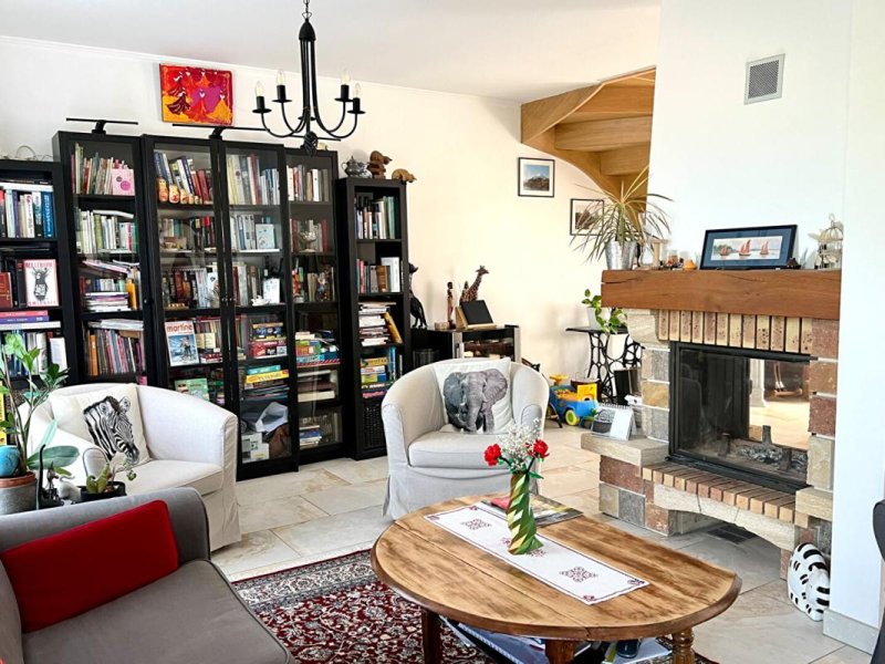 Au rez de chaussée : pièce de vie de 50m2 lumineuse avec cheminée insert double face , cuisine A/E avec accès terrasse , une chambre , une salle de bains avec rangements intégrés , wc
