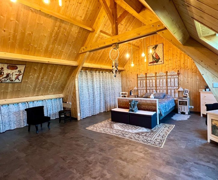 A l étage : espace bureau , suite parentale chaleureuse d environ 45m2 avec nombreux rangements , salle d eau avec rangements , wc .