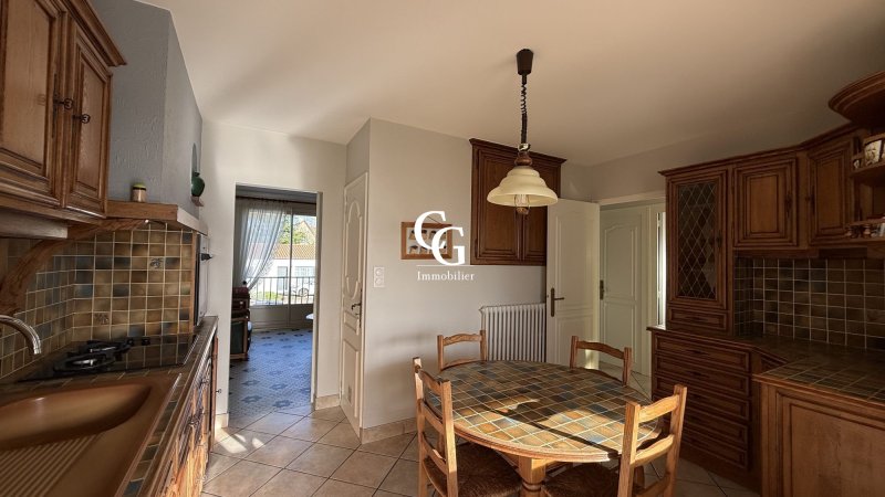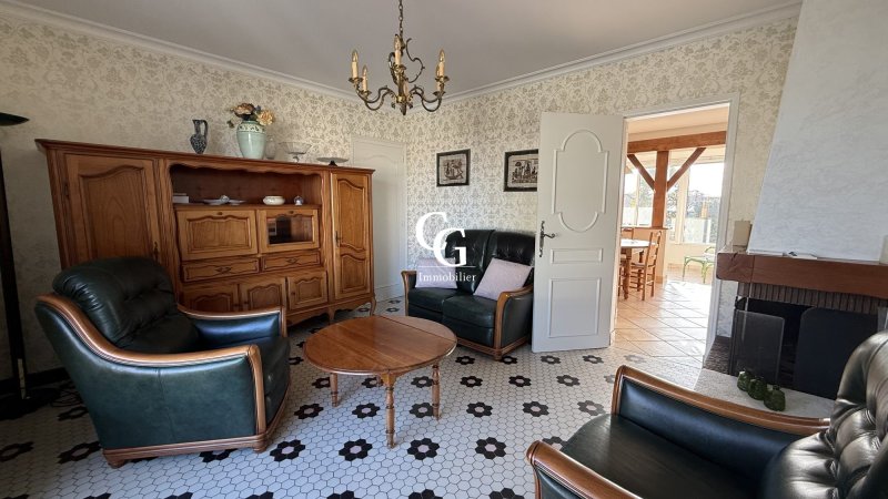 Le Cabinet Guémené vous présente en exclusivité, à l'entrée du bourg de VIEILLEVIGNE : Sur son terrain entièrement clos de 824m², une maison sur sous-sol d'une surface habitable de 87m² avec accès direct côté jardin comprenant : Une véranda chauffée de 16m² avec vue sur le jardin exposée Sud/Ouest, dans la continuité, une cuisine ouverte aménagée et équipée de 11m², un salon indépendant avec cheminée de 15m² donnant sur balcon, couloir desservant 3 chambres sur parquet avec placard, une salle de bains, wc indépendant. Au sous-sol : garage carrelé de 52m² avec portail motorisé, buanderie, pièce annexe avec cheminée, salle d'eau avec wc et nombreux placards de rangement. En annexes, dépendances dans le jardin, coin préau. Informations importantes : Chauffage au Gaz de ville (chaudière de 2023), isolation des combles refaite, façade avant isolée avec bardage extérieur de 2019. Maison bien entretenue proposant un jardin clos agréable, une surface utile avec son sous-sol, et proche du bourg et de ses commodités. Honoraires inclus de 5% TTC à la charge de l'acquéreur. Prix hors honoraires 185 000 . Classe énergie D, Classe climat D Montant estimé des dépenses annuelles d'énergie pour un usage standard : entre 1500.00 et 2080.00 sur les années 2021, 2022 et 2023 (abonnements compris). Les informations sur les risques auxquels ce bien est exposé sont disponibles sur le site Géorisques : georisques.gouv.fr.