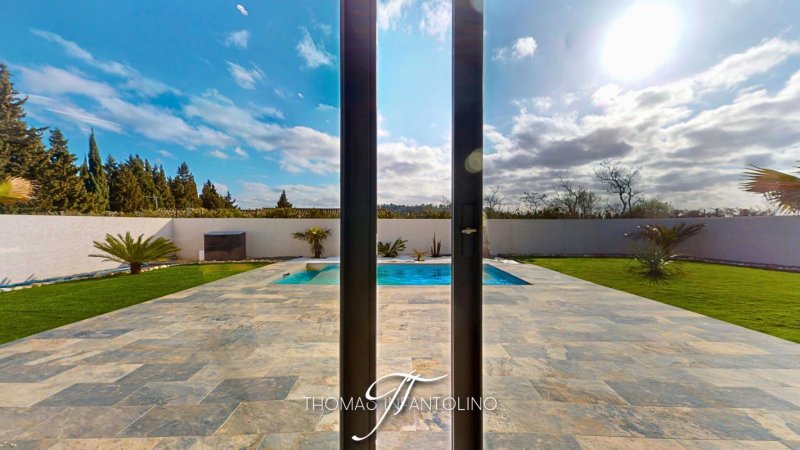 Le séjour bénéficie d'une grande baie vitrée à galandage exposée plein sud, apportant une luminosité exceptionnelle et une ouverture directe sur une vaste terrasse en pierre de Bali. Vous profiterez également d'une piscine élégante ainsi que d'un jardin privatif avec une vue dégagée.