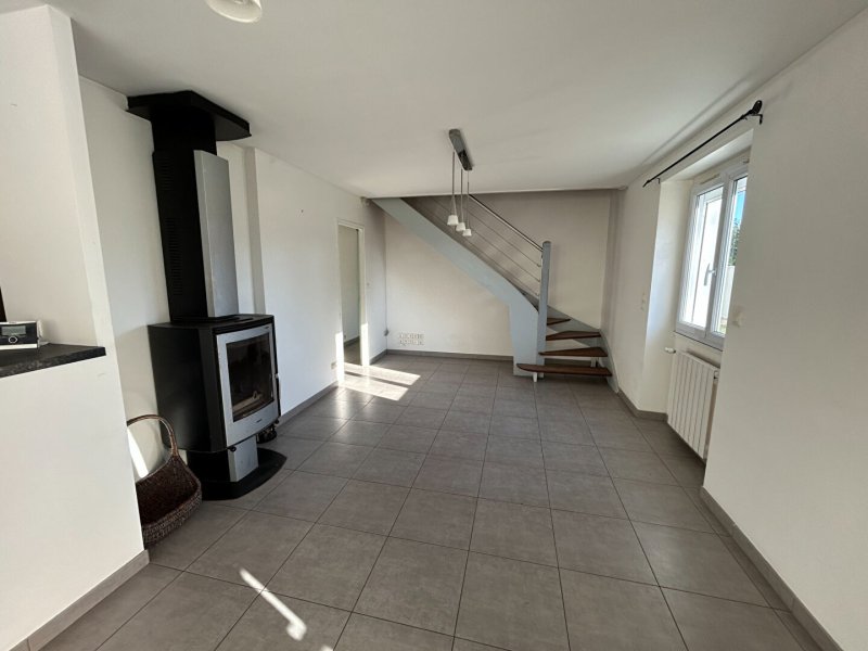 Elle s'ouvre sur une pièce de vie lumineuse avec cuisine ouverte aménagée et équipée, réchauffée par un poêle à bois. Ce niveau comprend également une salle d'eau, une pièce aménagée avec rangements (idéale en buanderie, chambre ou salle de jeux), un cellier fonctionnel et un WC séparé.